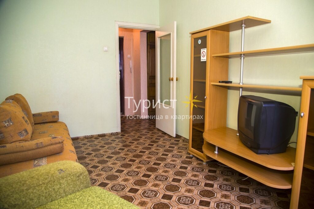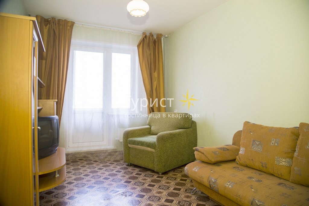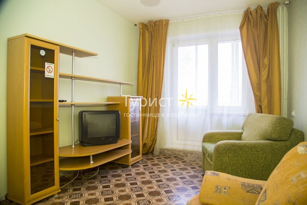 Мягкий диван и комфортное кресло стоят напротив телевизора и небольшого шкафа, где гости смогут поставить свой багаж.